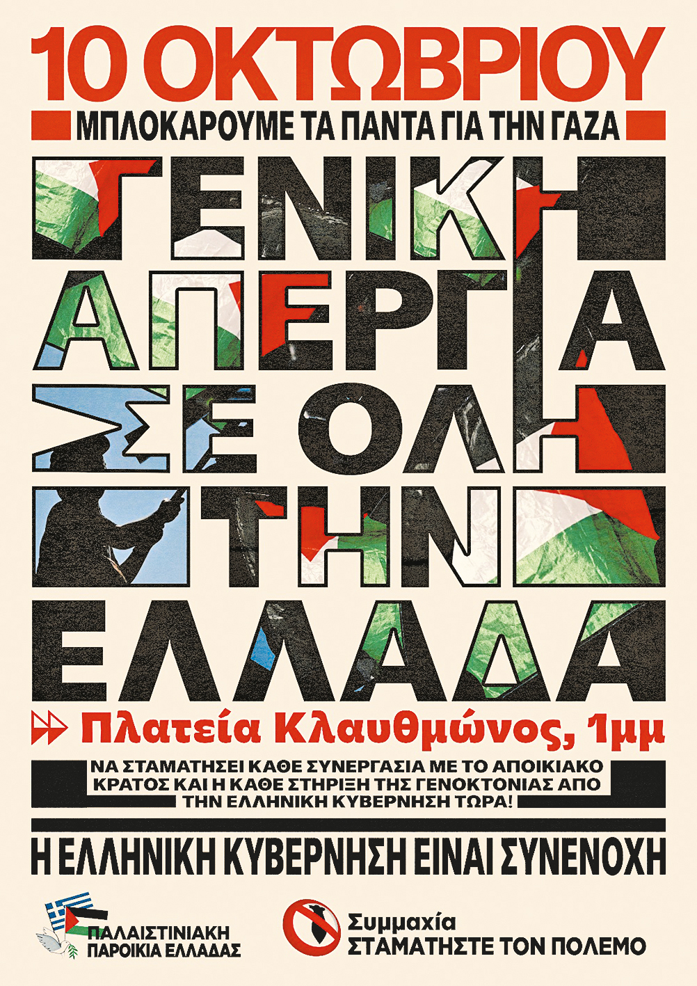 Τώρα είναι η ώρα να κλιμακώσουμε την αλληλεγγύη στην Παλαιστίνη - Απεργία 10 Οκτώβρη και συλλαλητήριο πλ. Κλαυθμώνος 1μμ