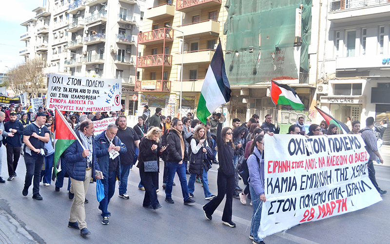 Ακολούθησε δυναμική πορεία με κατεύθυνση το αμερικάνικο προξενείο στο κέντρο της πόλης, με τη συμμετοχή της ΚΕΕΡΦΑ, φοιτητικών συλλόγων, ΕΛΜΕ και ΣΕΠΕ, του ΣΕΤΕΠΕ, του ΣΕΚ και της ΑΝΤΑΡΣΥΑ, καθώς και πολλών οργανώσεων της αριστεράς και του αντιεξουσιαστικού χώρου. Κεντρικά συνθήματα ήταν τα «Κάτω τα χέρια απ’ το Ιράν», «Καμία εμπλοκή στον πόλεμο», «Τέμπη-Πύλος-Χίος-Παλαιστίνη, δεν υπάρχει ειρήνη χωρίς δικαιοσύνη». Η πορεία κατέληξε στο ΥΜΑΘ, στέλνοντας σαφές μήνυμα ενάντια στην εμπλοκή της ελληνικής κυβέρνησης στον πόλεμο».