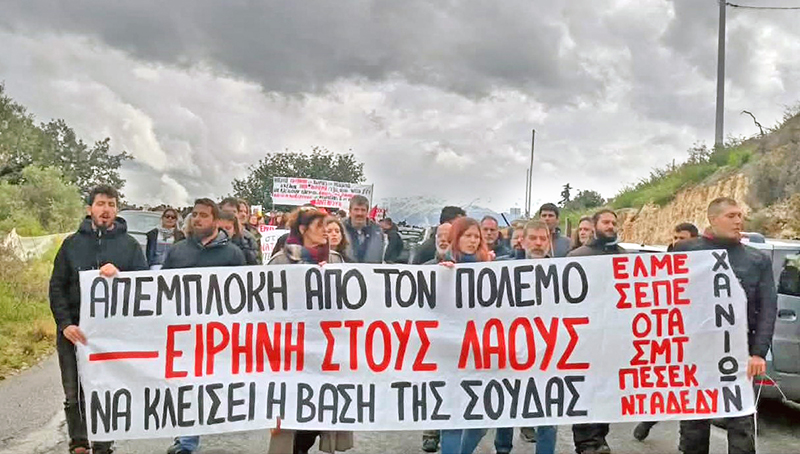 Η πορεία κατευθύνθηκε προς τις αμερικανικές βάσεις στο Μαράθι. Οι αστυνομικές δυνάμεις είχαν κλείσει τον δρόμο περίπου δύο χιλιόμετρα πριν την είσοδο της βάσης και έκαναν χρήση χημικών, σε μια κίνηση που φανερώνει τον πανικό της κυβέρνησης απέναντι στο αντιπολεμικό και εργατικό κίνημα, αλλά και την άμεση συμμετοχή της στις πολεμικές διαδικασίες».